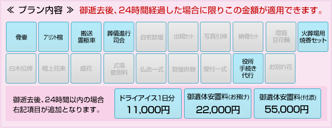 基本的には故人様が御逝去後24時間が経過されている場合に限り適用されるプランではありますが、御逝去後、24時間以内の場合必要に応じて(ドライアイス1日分・御遺体安置料(お預け)・ 御遺体安置料(付添))を追加する事ができます。